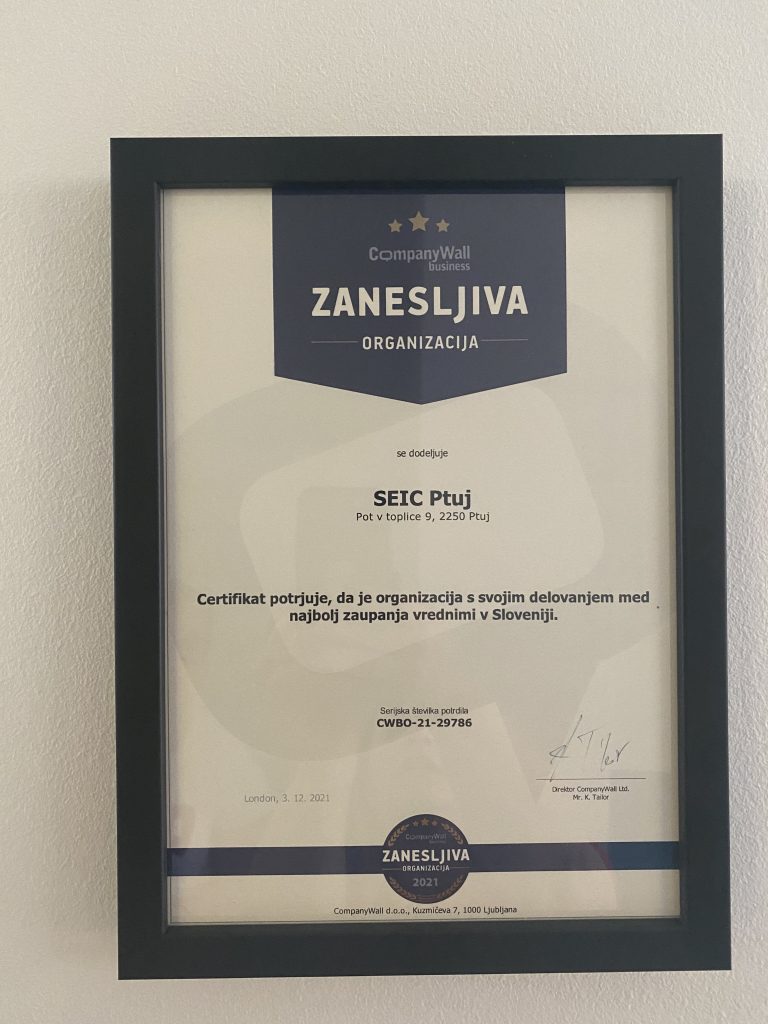 Certifikat potrjuje, da je zavod SEIC kot organizacija s svojim delovanjem med najbolj zaupanja vrednimi organizacijami v Sloveniji.